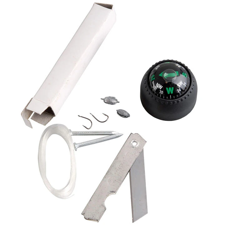 An indispensable companion for the outdoors, this emergency tool kit includes (or can be used as) a shovel, axe / hatchet, saw, hammer, wrench (3 sizes), nail puller, bottle opener, compass, knife / blade, fishing line, fishing hook and nails.
