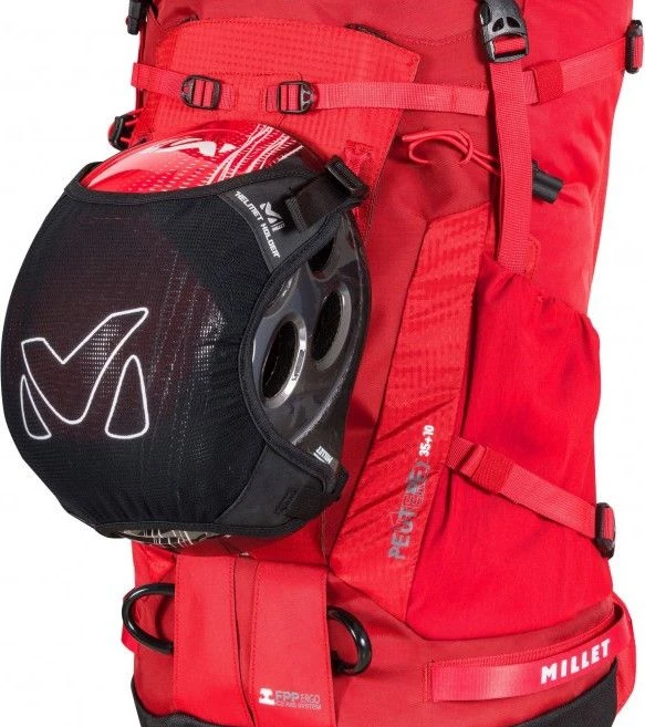 Removable and compactable helmet holder. Fits on all volumes of backpacks with side compression straps. New technical solution MILLET, this flexible, minimalist and removable helmet holder, allows a perfect stowage of the helmet on the bag. With 4 attachment points and a stretch construction, it ensures a compact volume that is always tackled in the action to avoid imbalances and promote precision in the mountains. It intelligently adapts to all volumes of backpacks with side compression straps. Compactable and retractable, it comes in its storage pocket.