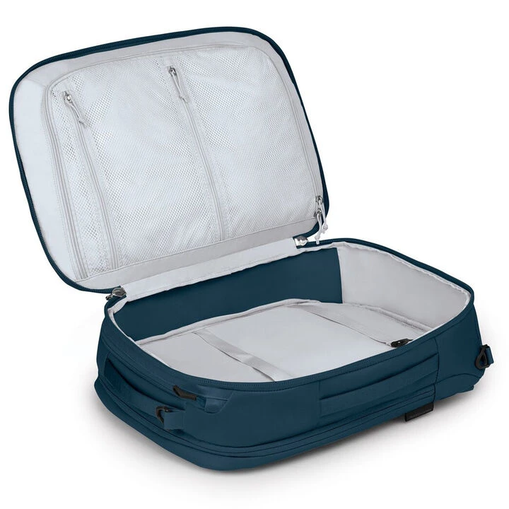 - Main bag divided 1/3, 2/3 by main zip and opens fully flat for easy packing