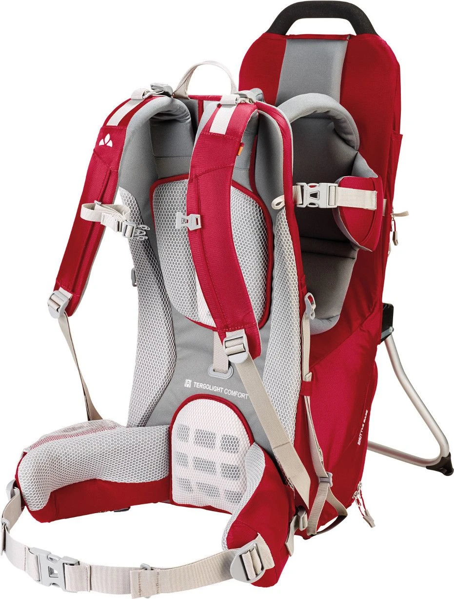 “Child’s play” on tour! A light version of our popular bestseller Shuttle Comfort – the newly developed Shuttle Base child carrier made from bluesign® certified primary material saves its future owner quite a bit in terms of weight. And yet it still features all of VAUDE’s expertise: a Tergolight suspension system and a load distributing hipbelt offers a secure and close fit to your back that’s really an advantage in uneven terrain. A no-pinch stand that can be opened and closed even while being carried as well as key attachment straps that are colored bright orange ensure TÜV certified safety. The Shuttle Base basically offers everything a good child carrier needs to have: adjustable straps and belts, reflective elements on the back, roomy pockets for easy-access storage of water bottles, diapers and small gear; a large bottom compartment to store large gear such as a seat pad, jacket, toys and snacks. The side foot loops can be adjusted to custom fit the child, helping to prevent “pins and needles” so they can enjoy the outing as much as you. A sun/rain canopy, a large raincover, a washable head rest and other accessories can be ordered separately. The Shuttle Base can safely carry children up to 105 cm or 18 kg. So let the adventure begin!